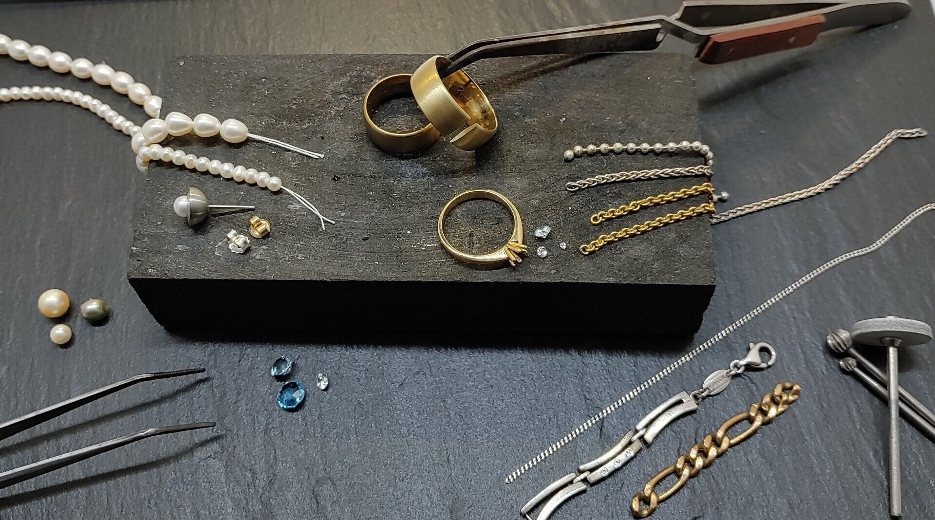 Perlenkettenknoten, Kettenlöten, Ringgrößenänderung, Batteriewechsel, Austausch von Verschlüssen, Fasserarbeiten, Steinersatz und vieles mehr.